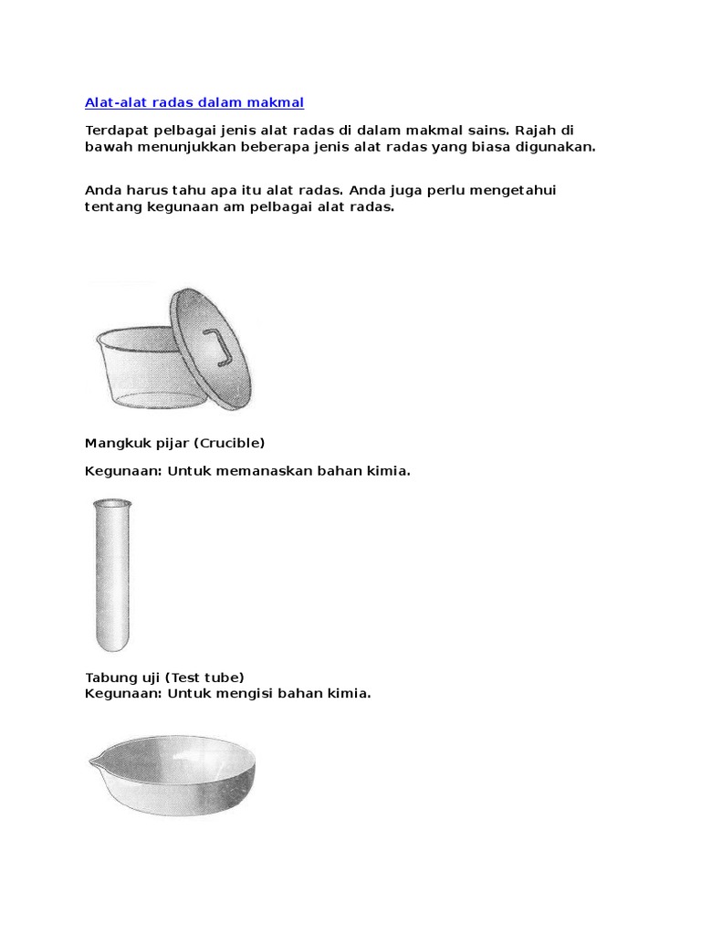 Anda harus tahu apa itu alat radas. Rajah di bawah menunjukkan beberapa jenis alat radas yang biasa digunakan. Letakkan termometer makmal ke dalam bikar itu. Guru yang hendak mengunakan sumber atau bahan radioaktif di dalam makmal sains sekolah hendaklah guru yang berpengetahuan dan. Logam aktif bahan kimia gas spesimen biologi alatan kaca radas alat elektrik pendawaian, punca kuasa, palam.