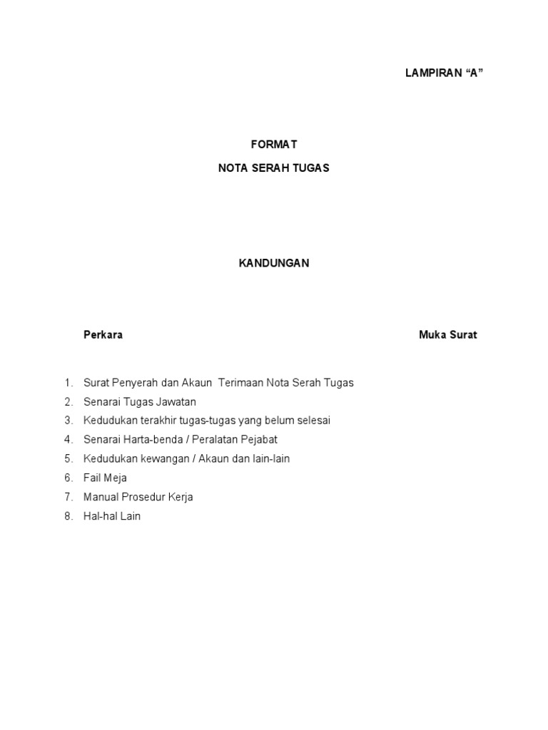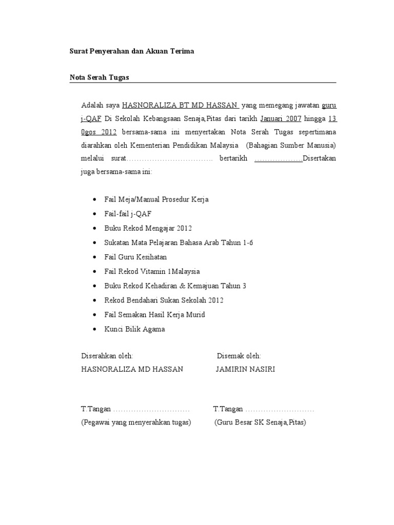 Nota Serah Tugas 1 from imgv2-1-f.scribdassets.com Surat penyerahan dan akuan terima nota serah tugas 2. Contoh nota serah tugas 2. Senarai tugas jawatan bidang tugas 1. Senarai hartabenda/peralatan pejabat iv 5. Senarai tugas jawatan ii 3. Nota serah tugasen azman bin safiipenolong kanan kokurikulum smk tunku abdul rahman putra, kulai, johor. Setiap proses pertukaran, naik pangkat, atau penamatan perkhidmatan pegawai perlu disertakan dengan nota serah tugas yang sesuai dan selaras dengan panduan yang dikeluarkan oleh kerajaan malaysia. Bagi seorang guru yang berpindah sudah pastilah wajib membuat nota serah tugas ini, supaya segala tanggungjawab yang dipikul sebelum ini dapat diamanahkan.