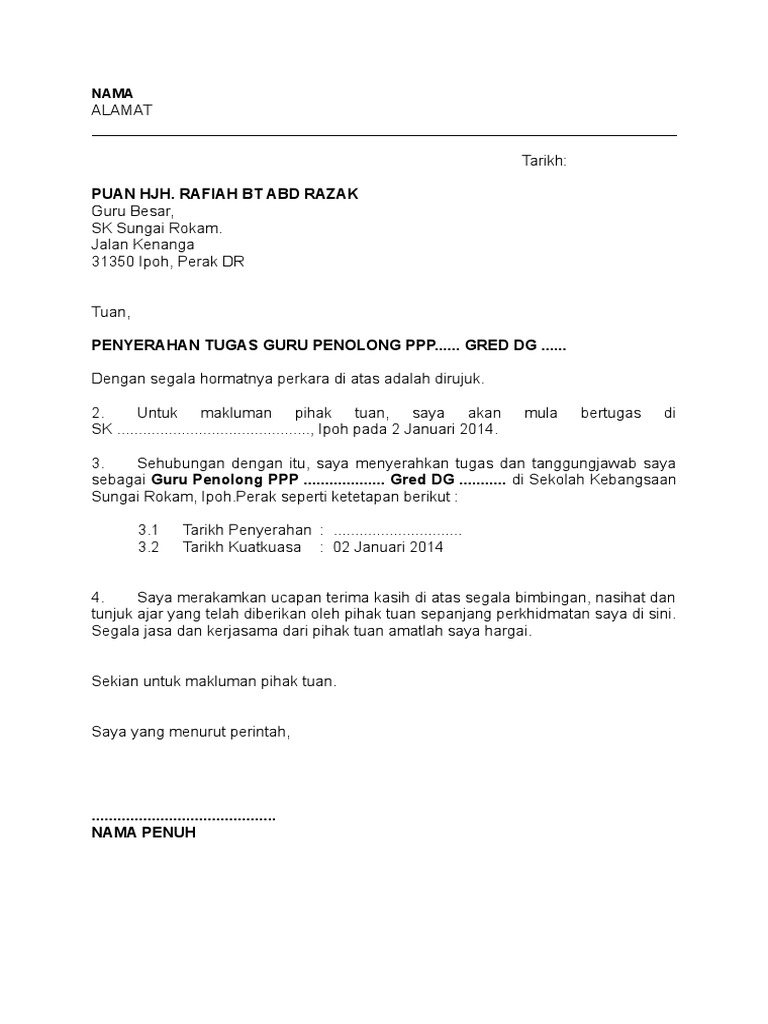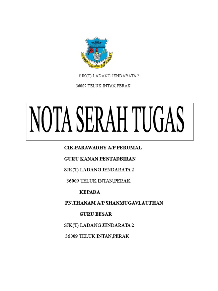 Nota serah tugas guru berpindah sekolah by raisyahm. Serah tugas guru by intan idora 4976 views. Senarai tugas jawatan ii 3. Nota serah tugas ini juga merupakan arahan oleh jabatan perkhidmatan awam bagi penjawat awam yang berpindah atau bertukar. Pertukaran merupakan salah satu fungsi pengurusan sumber manusia.
